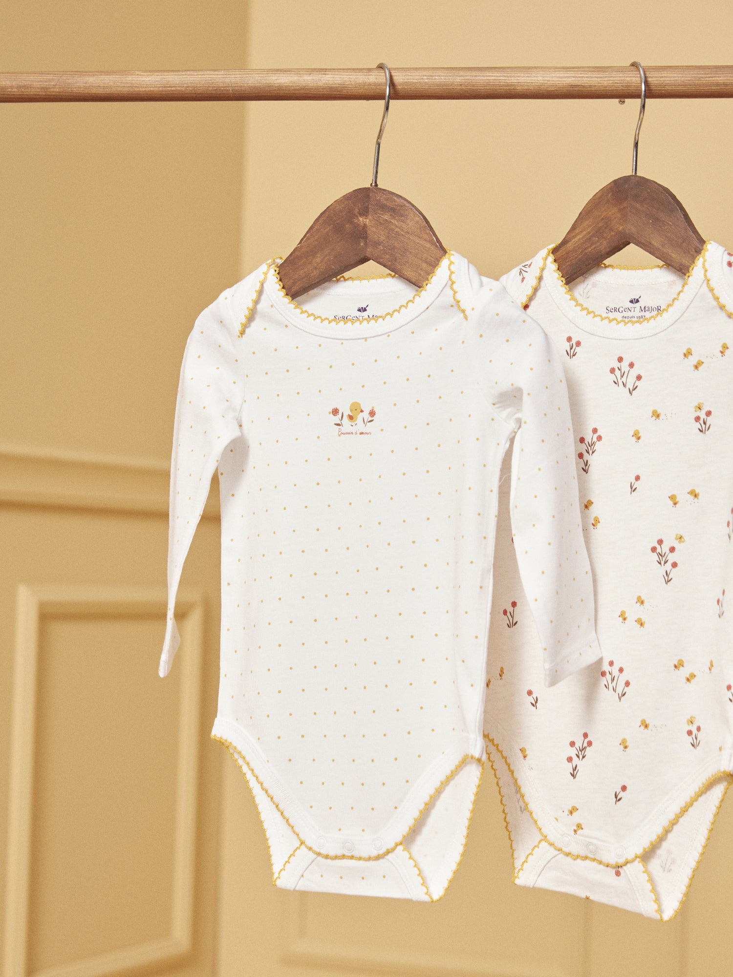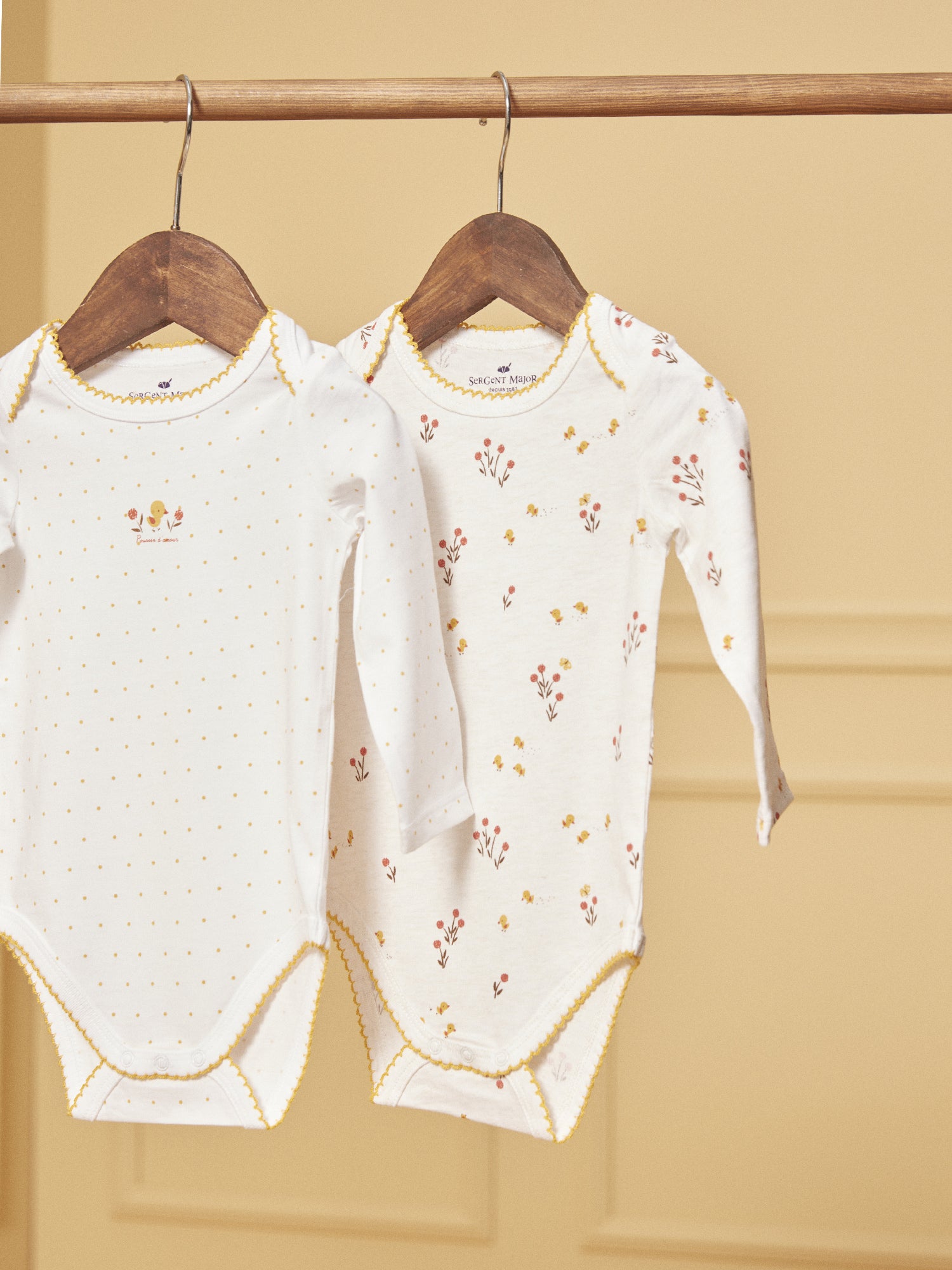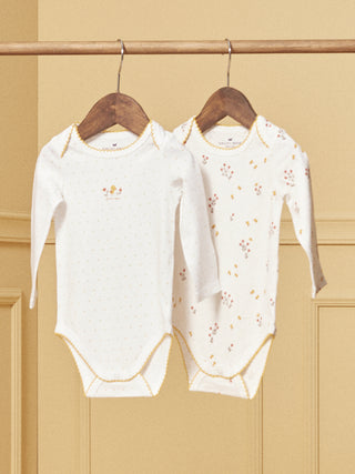 Offrez à votre petite fille douceur et confort avec ce lot de 2 bodies en coton biologique, vendu dans une boîte pratique :Body 1 : Body en jersey beige chiné clair avec un imprimé de petits poussins et fleurs dans les tons jaune poussin, rouge orangé et brun. Le tour des cuisses et le col sont ornés de finitions en picots de couleur jaune poussin, ajoutant une touche délicate.Body 2 : Body en jersey écru à pois jaune poussin avec un imprimé sur le buste d'un petit poussin avec des fleurs dans les tons jaune poussin, rouge orangé et brun, accompagné de l'inscription Poussin d'amour. Le tour des cuisses et le col sont également finis avec des picots de couleur jaune poussin.Ces bodies sont conçus pour offrir confort et style à votre bébé fille tout en respectant les normes biologiques. Le lot est parfaitement emballé dans une boîte, idéale pour offrir en cadeau ou pour ranger les vêtements de votre bébé.