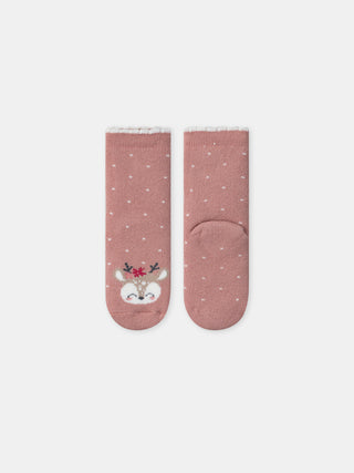 Ces chaussettes réchauffent les petits pieds en hiver. En maille douce avec finition coquille, elles sont agréables à porter. Leur motif biche vieux rose et petits points écrus rappellent la nature hivernale.