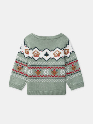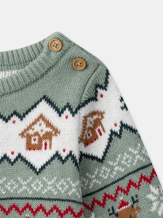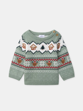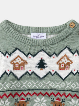 Pour les bébés curieux et souriants en hiver, ce pull enveloppe de douceur et de chaleur. Maille fine avec ouverture au col par boutons pour faciliter l’habillage. Jacquard de Noël avec rennes, sapins et flocons pour des moments festifs et familiaux.