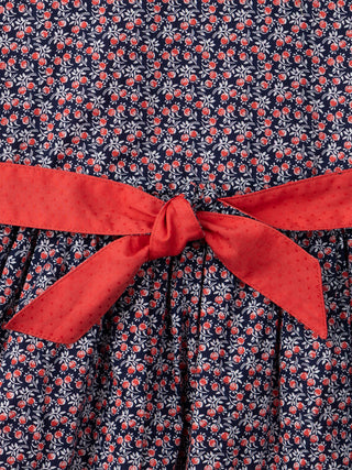- Fond écru à motifs baies rouges et bleu marine, ceinture à la taille