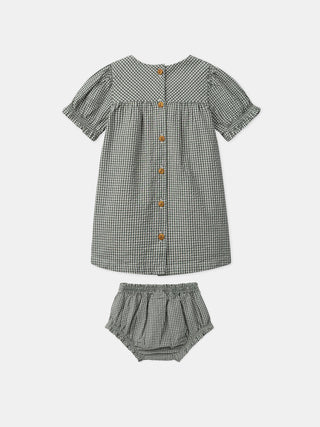 Cette robe vichy est idéale pour les journées estivales, alliant confort et élégance. Les manches ballons et les fleurs brodées sur le buste dans des tons rose pâle, fluo et corail, ajoutent une touche douce et colorée, tandis que les détails coquilles sur le buste renforcent son charme. L'ouverture intégrale au dos par boutons en bois et le bloomer assorti garantissent une allure pratique et coordonnée.