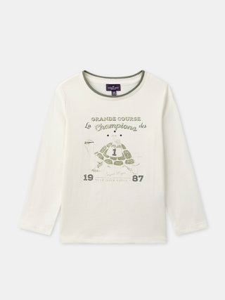 Pour un enfant tendre et sensible, idéal au printemps. Le jersey au toucher peau de pêche offre un confort doux. La tortue imprimée et brodée ajoute une note poétique.